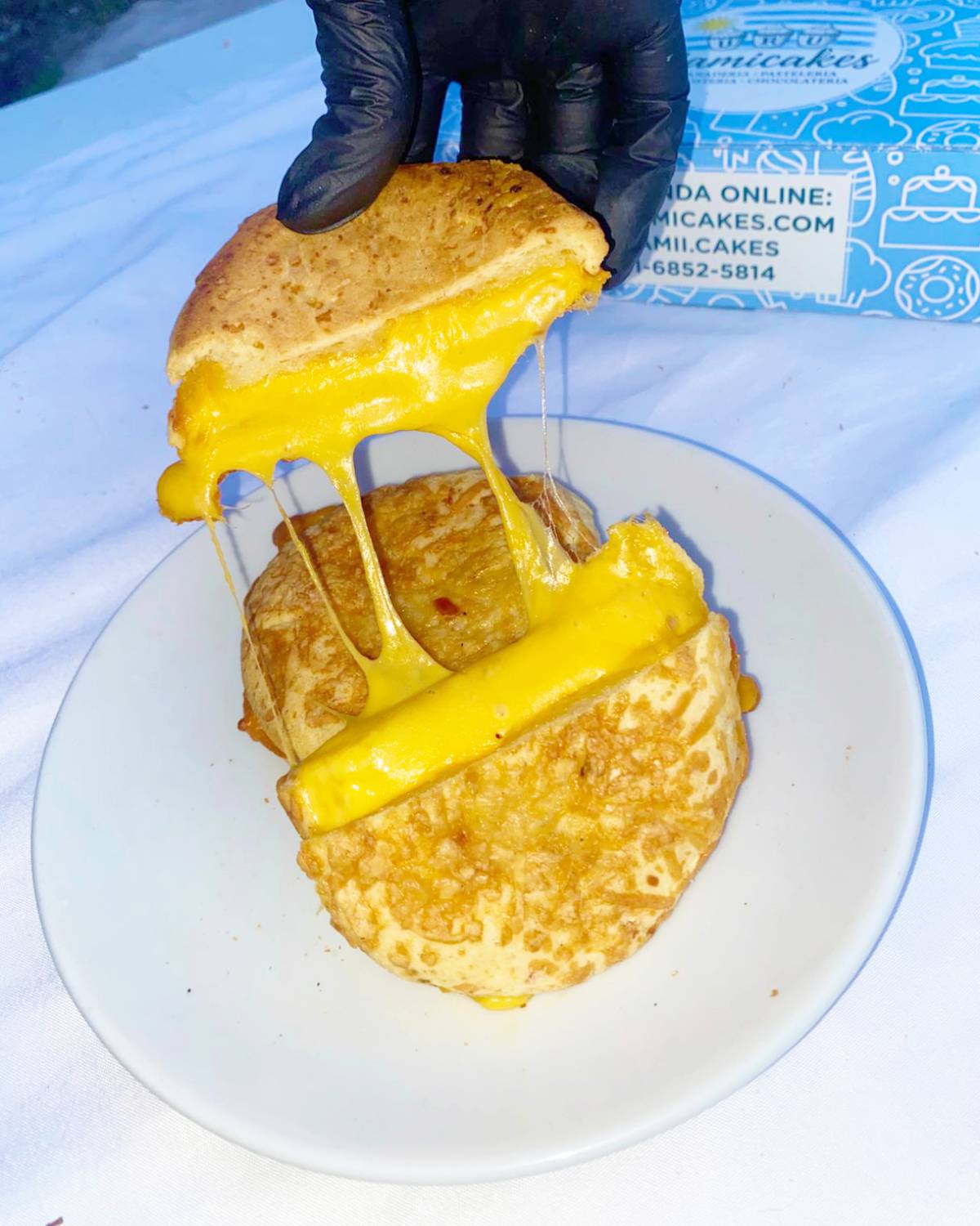 Tostado de lomito y cheddar con pan de chipa.